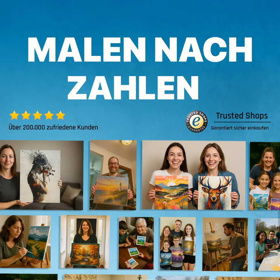 Nein. Das Prinzip Malen nach Zahlen ist so konzipiert, dass jede*r direkt loslegen kann. Jedes Feld trägt eine Zahl, die exakt einer Farbe entspricht – du musst also nur den Deckel öffnen und ausmalen. Zusätzlich liegt eine Schritt-für-Schritt-Anleitung bei, in der wir zeigen, wie du Farben mischst, Pinsel reinigst und trockene Übergänge vermeidest. Viele Kunden nutzen unsere Sets sogar als ersten Kontakt mit der Malerei und berichten, dass sie nach dem ersten Bild mutig zu komplexeren Motiven greifen.