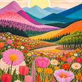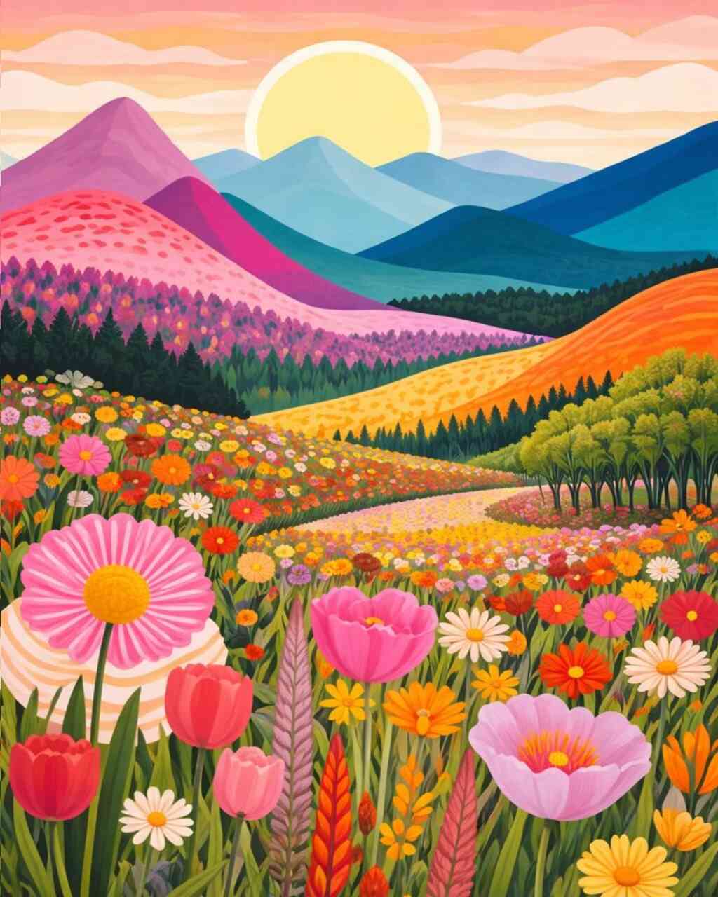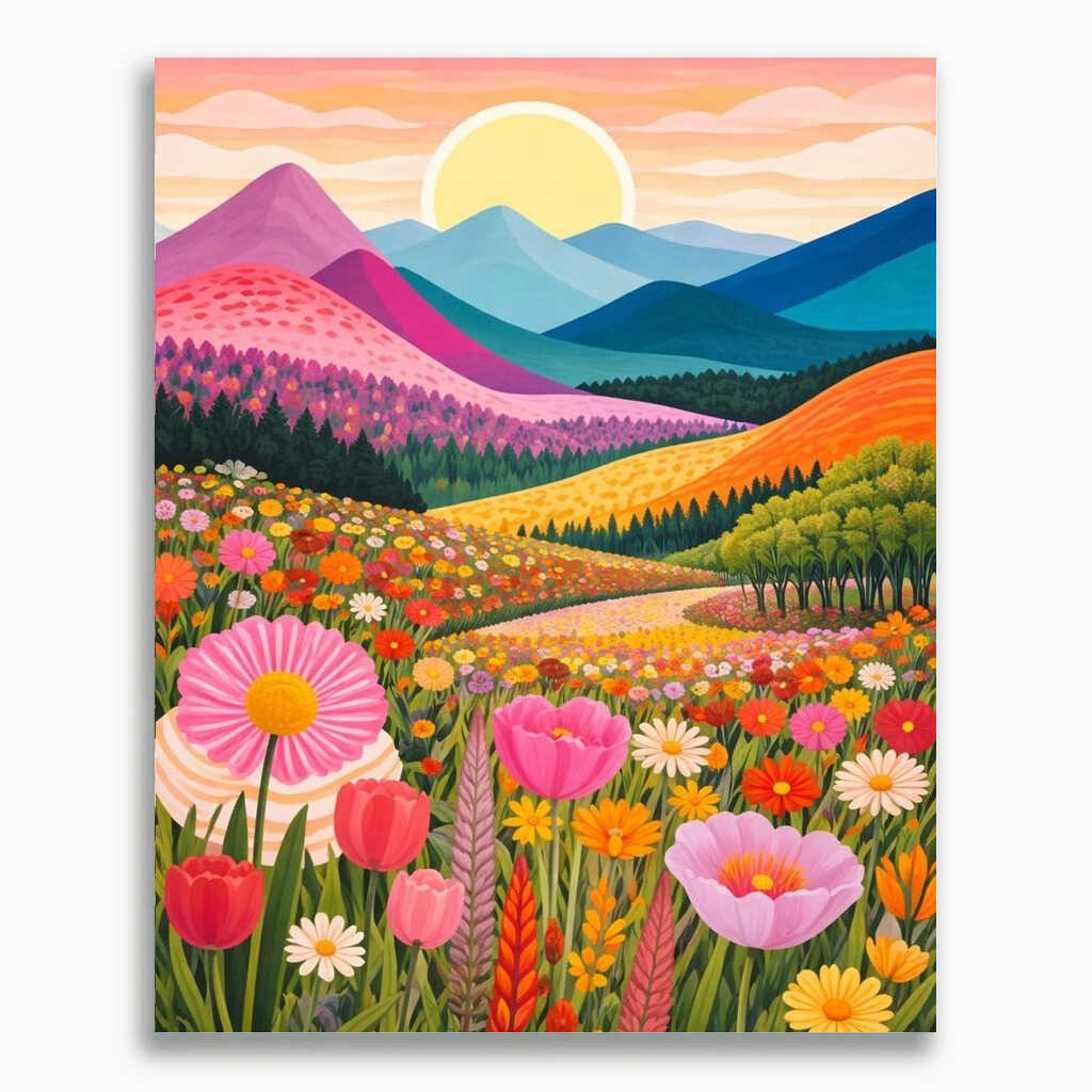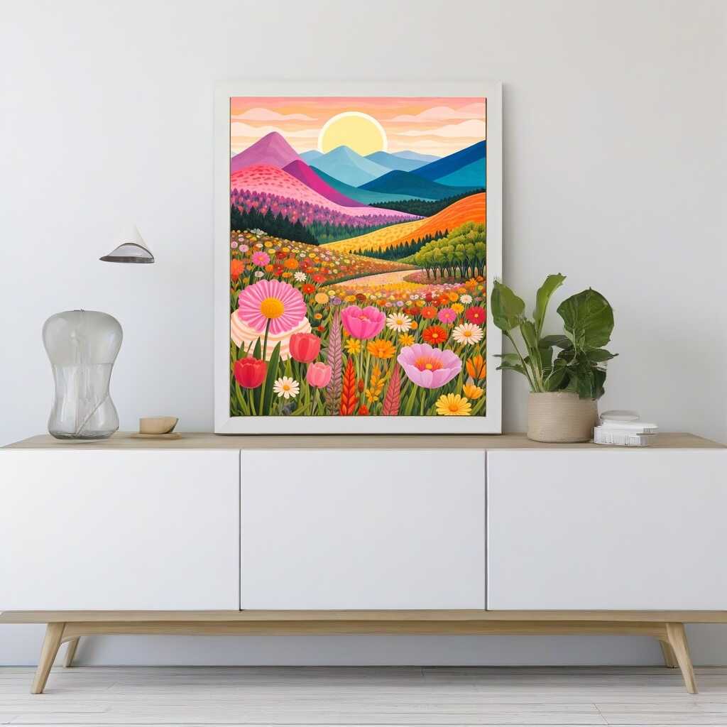 Ein zauberhaftes Sonnenlicht taucht eine mediterrane Landschaft in warme Töne. Satte Pink- und Orangennuancen umspielen sanfte Hügel, während ein wilder Blumenmeer in lebendigen Farben den Vordergrund schmückt. Ausdrucksstarke Linien und ein moderner, abstrakter Stil vermitteln Freude, Leichtigkeit und pure Lebenslust. Das Werk entführt den Betrachter in eine magische Welt voller Hoffnung und neuer Anfänge – ein Fest des Lebens für die Sinne.