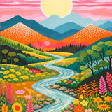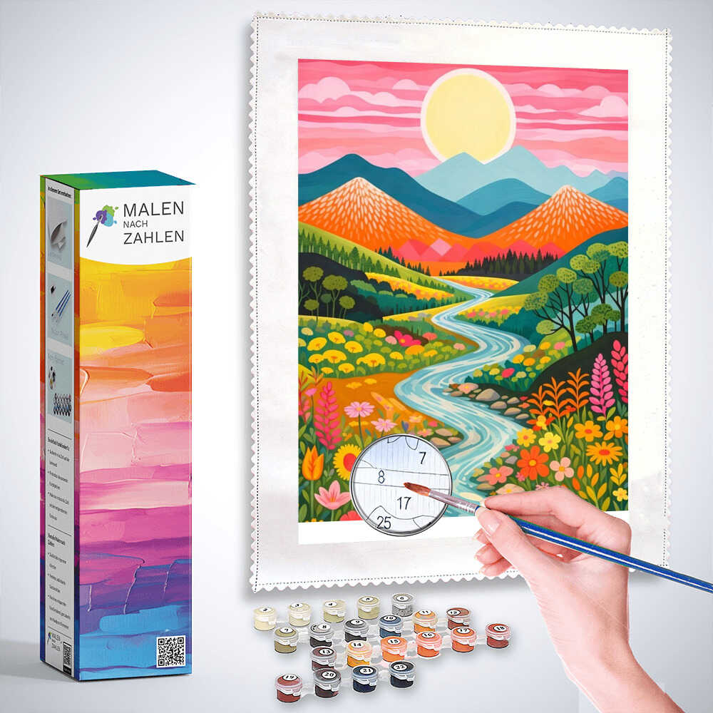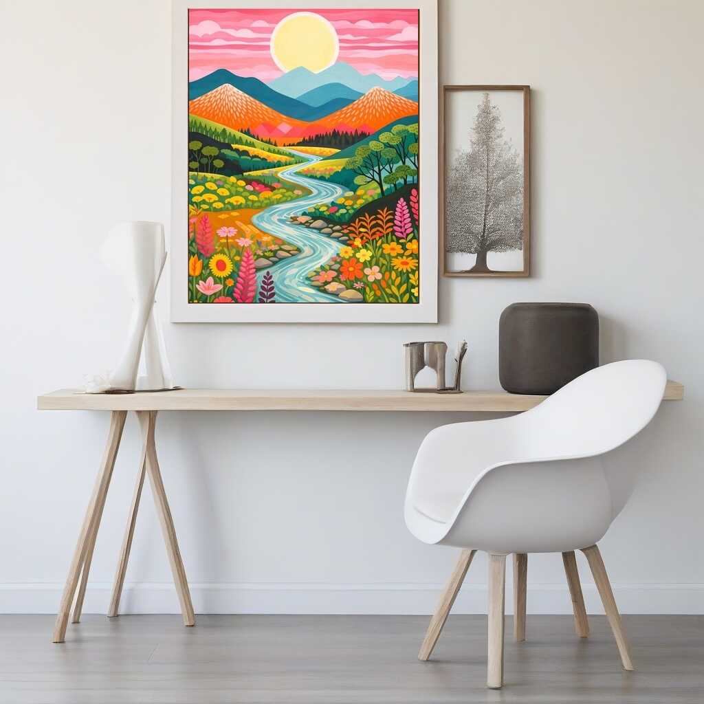 Ein strahlender Sonnenaufgang taucht ein Tal voller bunter Blumen in ein warmes Licht. Leuchtende Orangetöne der Berge und das leise Blau des Flusses verschmelzen im modernen, expressionistischen Stil. Das Motiv lädt mit detailreichen, fantasievollen Blumenwiesen und sanften Hügeln zum Träumen ein. Die harmonische Naturidylle verströmt Freude und Geborgenheit – ein Bild, das Herz und Sinne berührt und pure Lebensfreude entfacht.