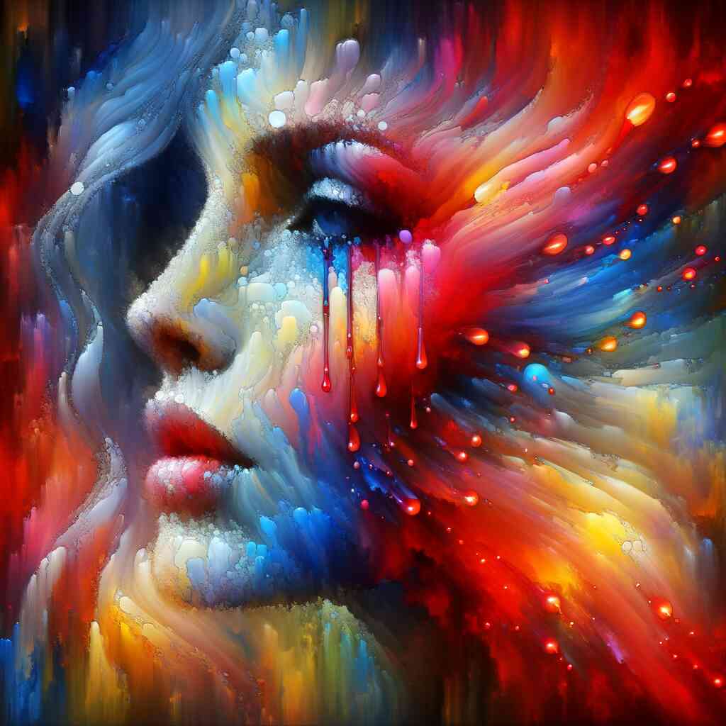 Abstract colorful portrait of a woman created with AB Diamond Painting, mixing vibrant reds, blues, and yellows, representing feminine beauty and strength.