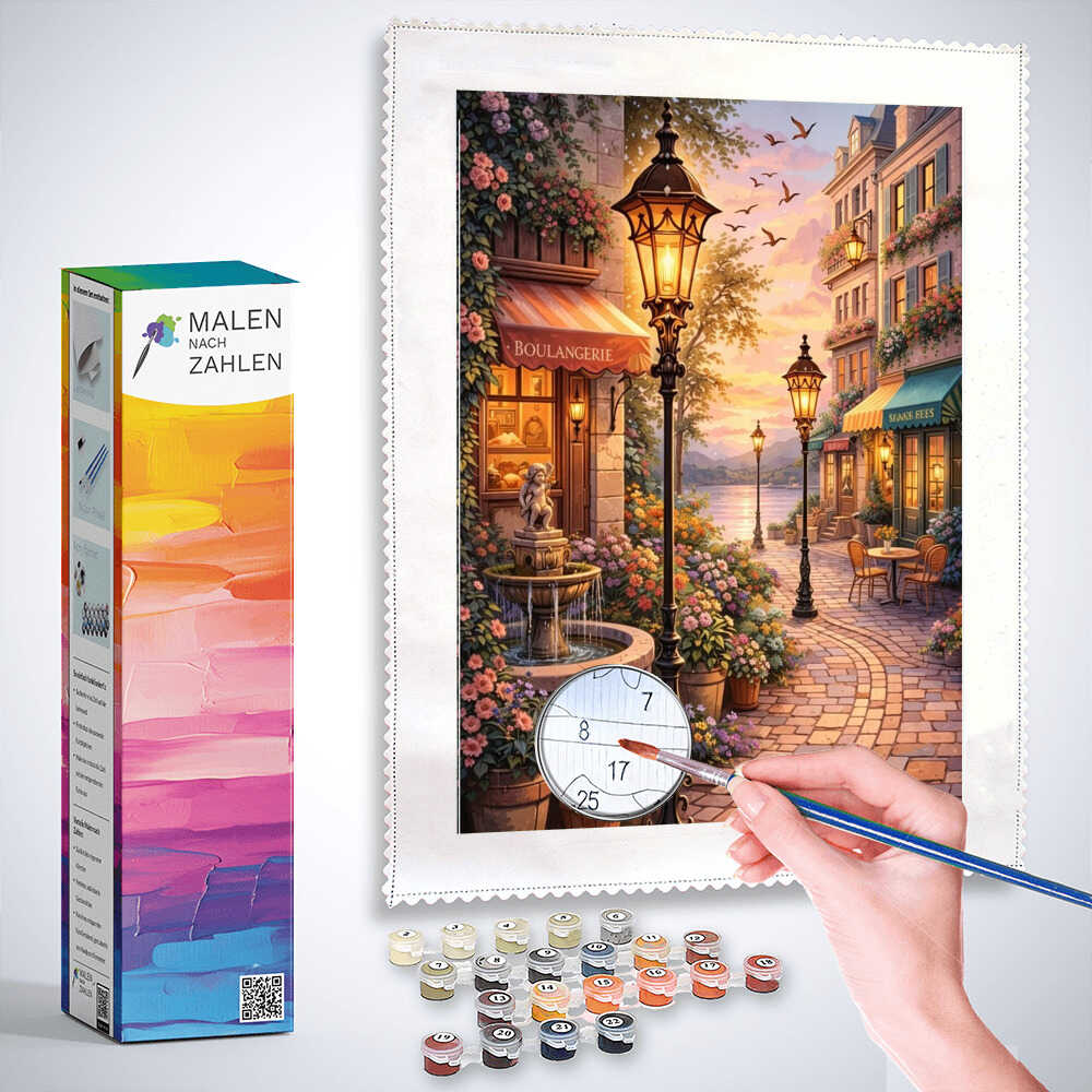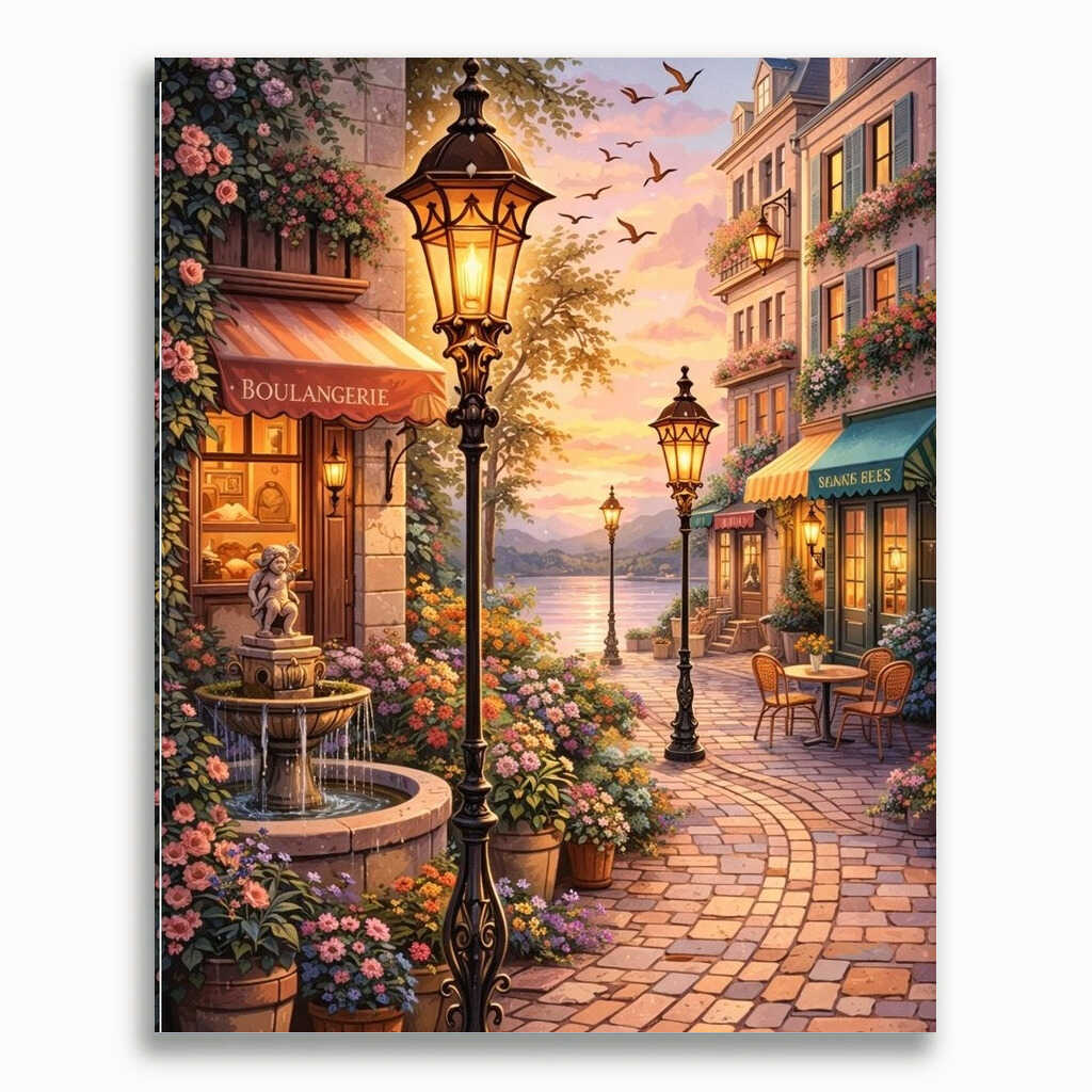 Dieses stimmungsvolle Kunstwerk strahlt pure Romantik und Lebensfreude aus. Warme Pastelltöne malen ein mediterranes Flusstal, beleuchtet von goldenen Laternen und blühenden Gassen voller Rosen. Die Szene balanciert zwischen lebendigem Impressionismus und feiner, moderner Detailverliebtheit. Der Duft von Frischgebackenem und Blumen liegt in der Luft – Idylle pur. Das Bild verzaubert den Betrachter, schafft Geborgenheit und weckt Sehnsucht nach verträumten Sommerabenden.