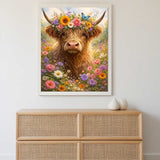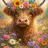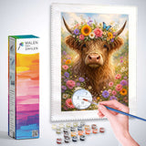 Mit sanfter Poesie zeigt dieses expressive Meisterwerk ein charmantes Hochlandrind inmitten eines prachtvollen Blumenmeers, gekrönt mit einem farbenfrohen Blütenkranz und einem Schmetterling. Leuchtende Gelb-, Rosa- und Lilatöne verschmelzen im fantasievollen Realismus. Das Thema Naturverbundenheit begegnet romantischer Freude; der friedliche Blick des Tieres weckt im Betrachter ein tiefes Gefühl der Geborgenheit, Leichtigkeit und Sommerträume. Ein Fest für die Seele!