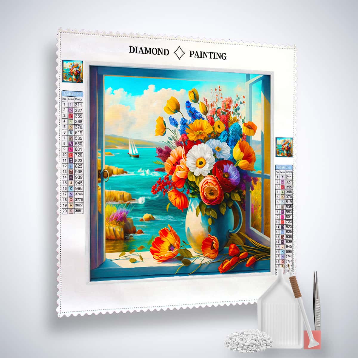 Diamond Painting Kit - Blumengesteck am Meer with vibrant flowers overlooking the ocean, including acrylic diamonds, tweezers, and setzstift.