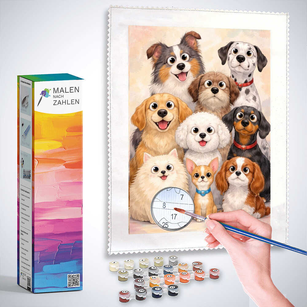 Dieses bezaubernde Kunstwerk strahlt pure Lebensfreude aus: Neun Hunde und eine Katze mit riesigen, leuchtenden Augen schauen voller Neugier und Freude in die Welt. Warme Pastellfarben, weiches Fell und fröhliche Mimik erwecken die Szene zum Leben. Im liebevoll illustrierten, modernen Stil vermittelt dieses Fantasy-Motiv unbeschwerte Freude und eine tiefe, herzerwärmende Verbundenheit – ein Bild, das jeden Betrachter zum Lächeln bringt.