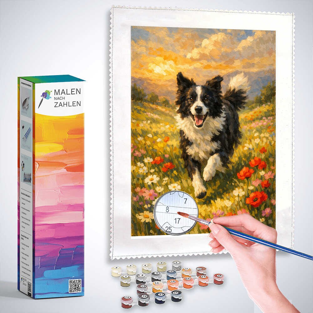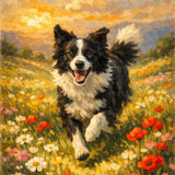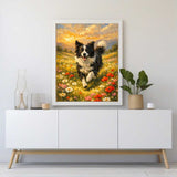 Ein strahlender Hund springt durch ein farbenfrohes Blumenmeer, während die goldene Abendsonne den Himmel in warme Pastelltöne taucht. Die leuchtenden Rottöne der Mohnblumen und das fröhliche Gelb der Gänseblümchen spiegeln die pure Lebensfreude wider. Dieses moderne, impressionistische Kunstwerk vermittelt ein Gefühl von Freiheit, Glück und Wärme – ein emotionaler Moment voller Leichtigkeit und unbeschwerter Freude, der jedes Herz berührt.