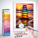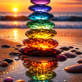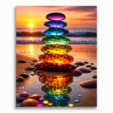 Im warmen Schein eines Sonnenuntergangs türmen sich schimmernde, bunte Glassteine zu einer leuchtenden Skulptur am Meeresufer. Ihre intensiven Regenbogenfarben spiegeln sich im nassen Sand und schaffen ein Gefühl von Harmonie und Energie. Thema: Meditation und Natur. Stil: Modern, Abstrakt. Dieses Kunstwerk entführt den Betrachter in eine Welt der Ruhe und verzaubert durch seine beruhigende und inspirierende Ausstrahlung.