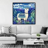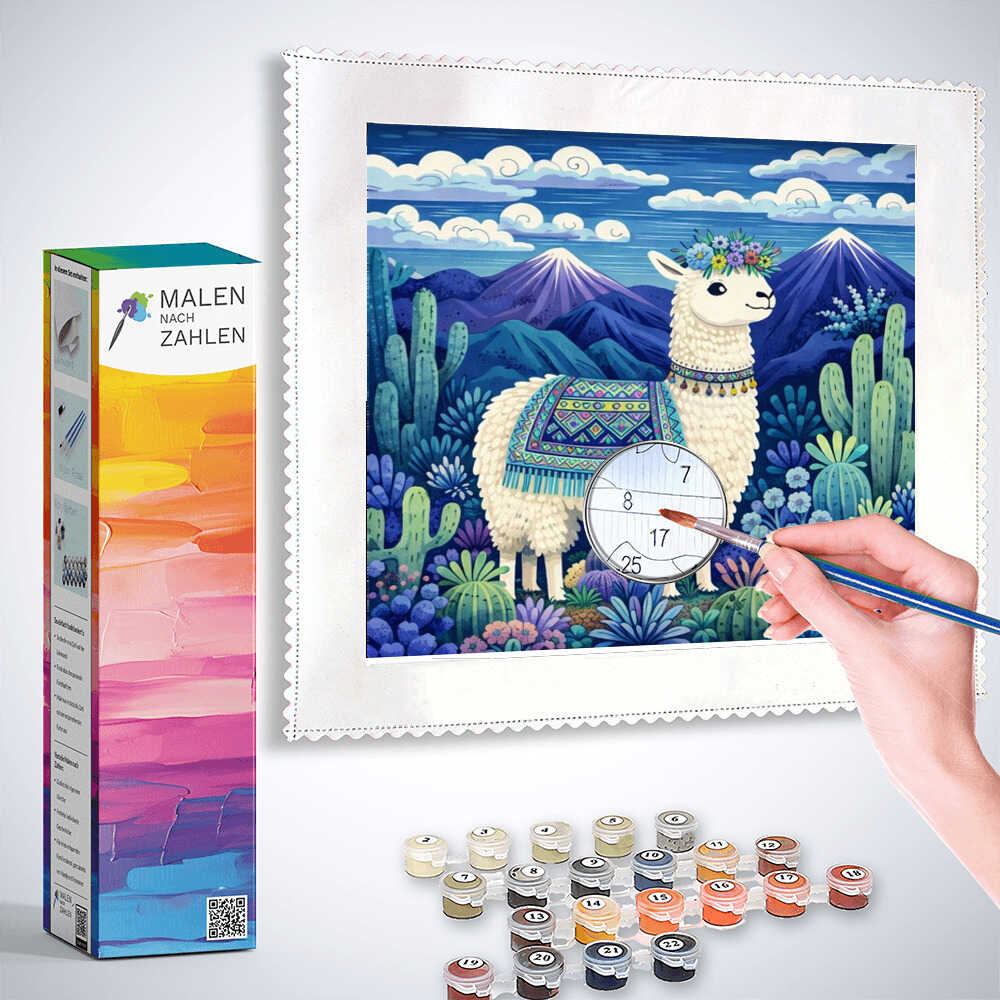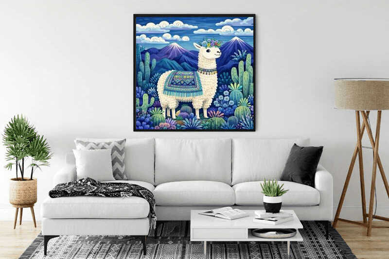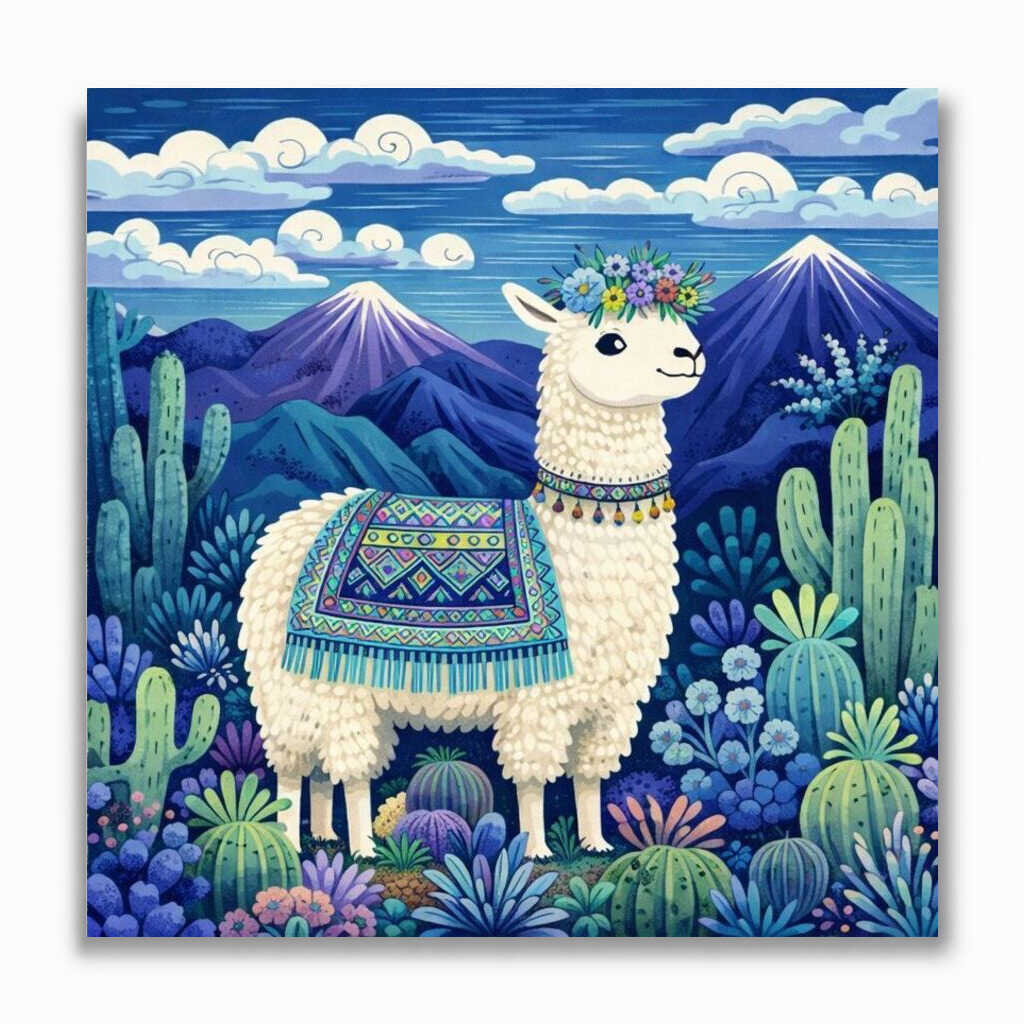 Ein zauberhaftes Alpaka erstrahlt im Mittelpunkt, umgeben von üppigen Kakteen und blühenden Pflanzen vor imposanten, blauen Berggipfeln. Die leuchtenden Türkis-, Violett- und Grüntöne vermitteln ein Gefühl von Fantasie und Lebensfreude. Inspiriert vom Ausdruck des modernen Folk-Stils, vereint dieses Werk das Thema „Fantastische Andenlandschaft“. Der fröhliche, verspielte Charakter weckt Staunen und zaubert jedem Betrachter ein Lächeln ins Gesicht.