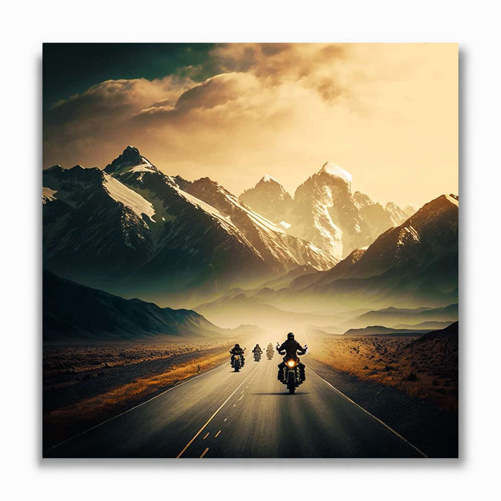Group of bikers riding on a road towards snow-capped mountains at sunset, representing the Malen nach Zahlen - Blitzschneller Biker painting.