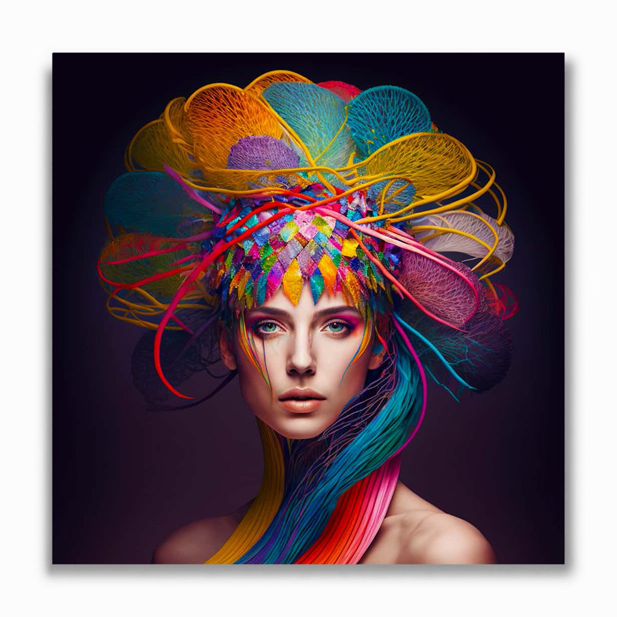 Woman with colorful headdress in vibrant painting, Malen nach Zahlen - relaxing painting activity, artistic expression.