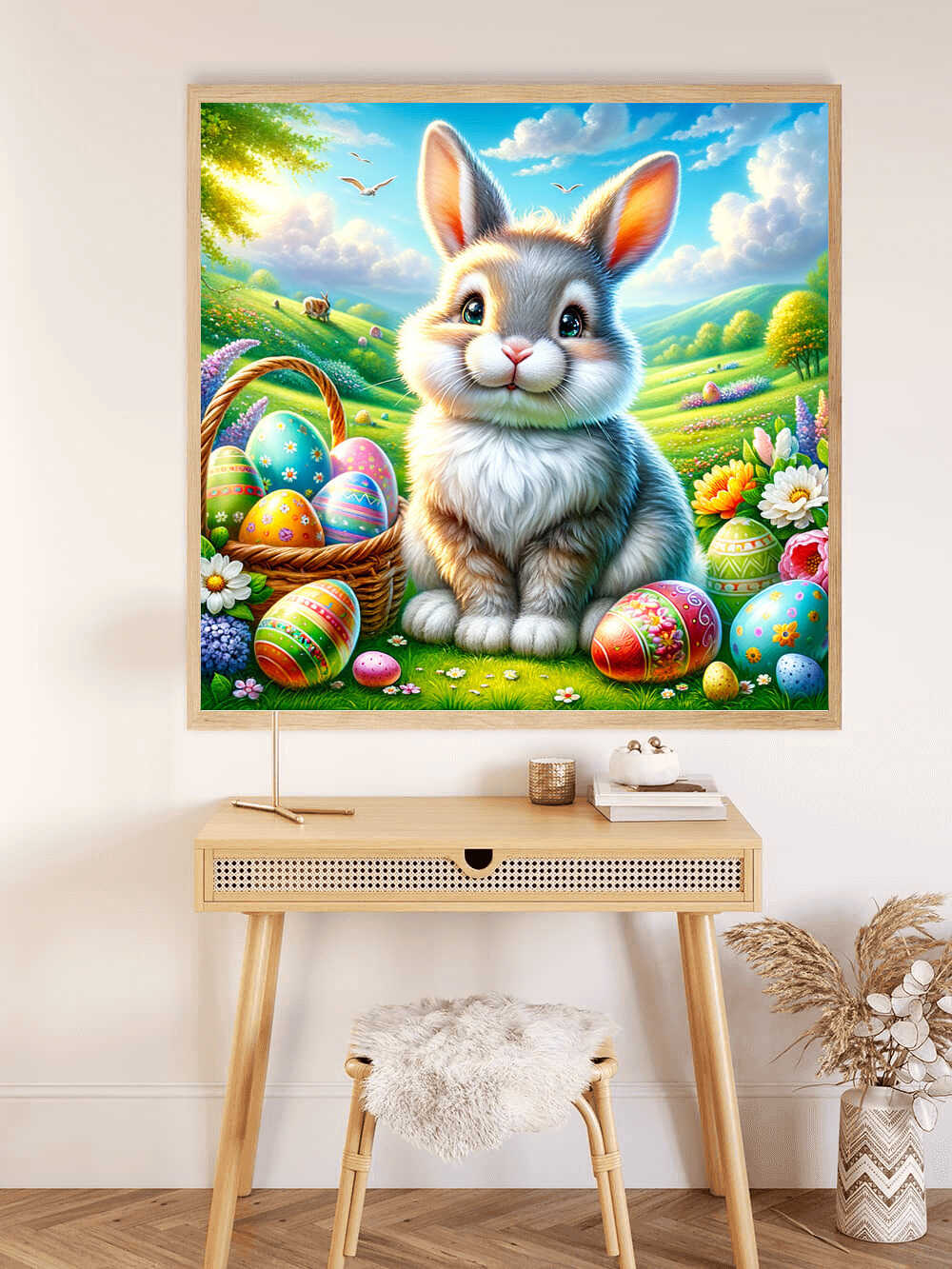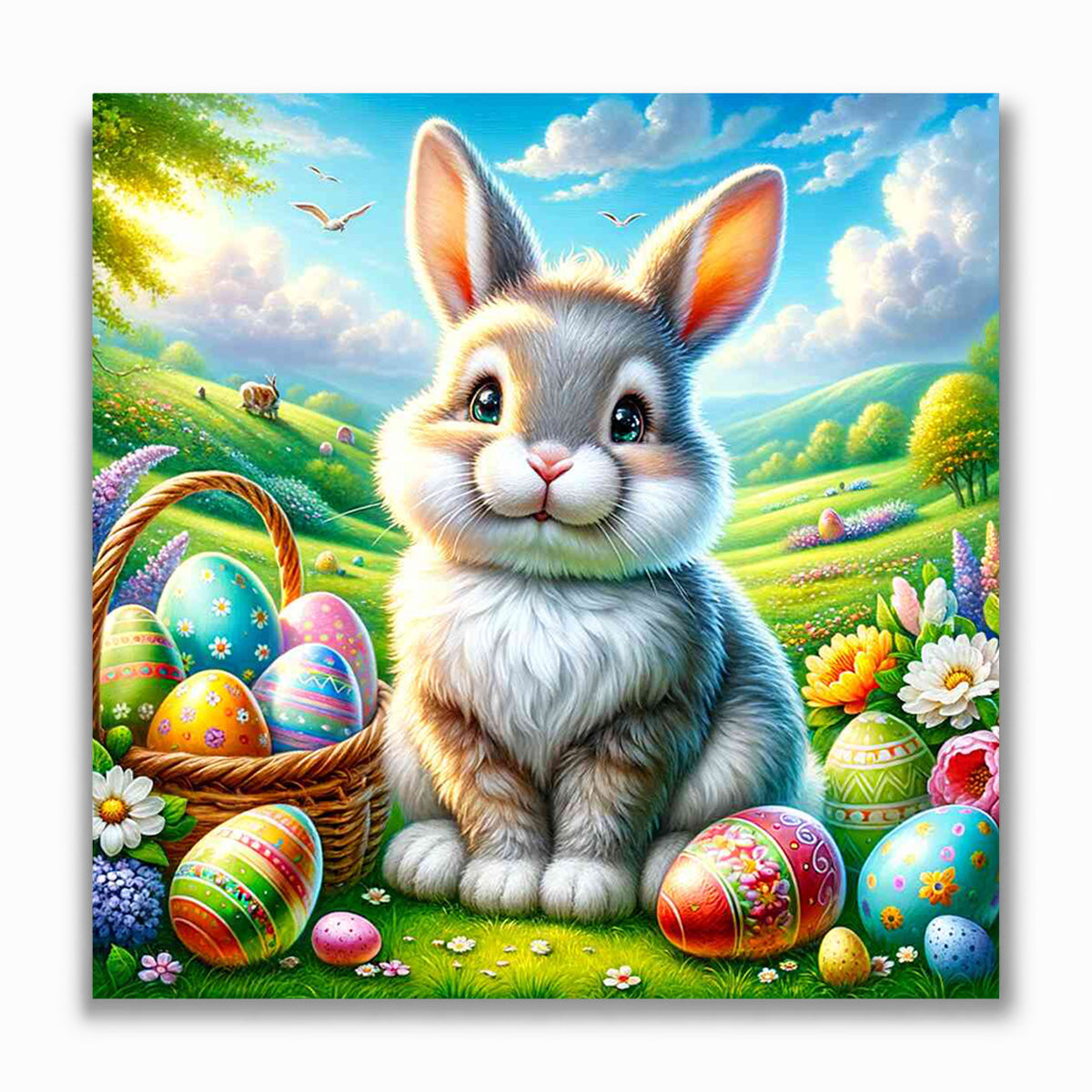 Easter Wonderland paint-by-numbers kit featuring a cute bunny with colorful Easter eggs in a vibrant spring meadow.