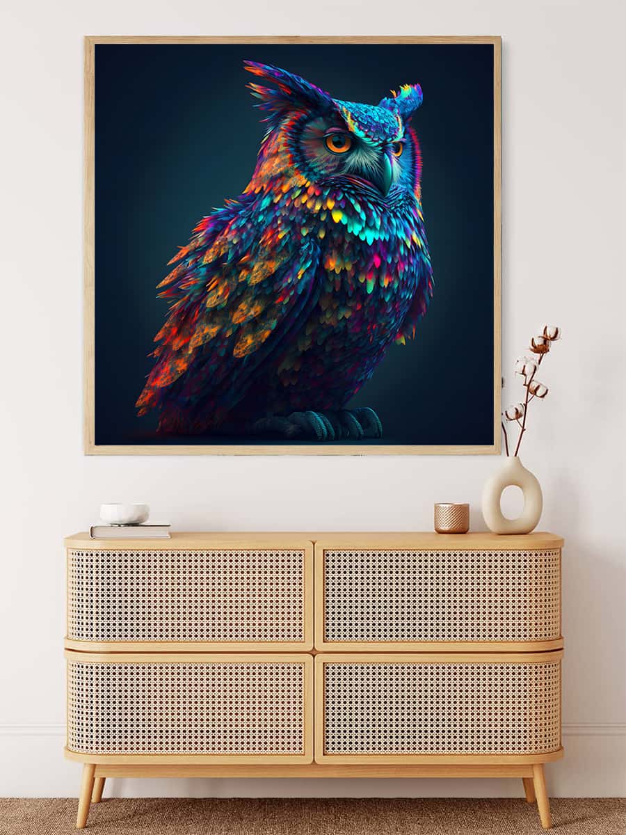 Malen nach Zahlen - Stolze Eule bei Nacht, farbenprächtige Eule auf Leinwand in modernem Raum, entspannende Kunst für Kreative